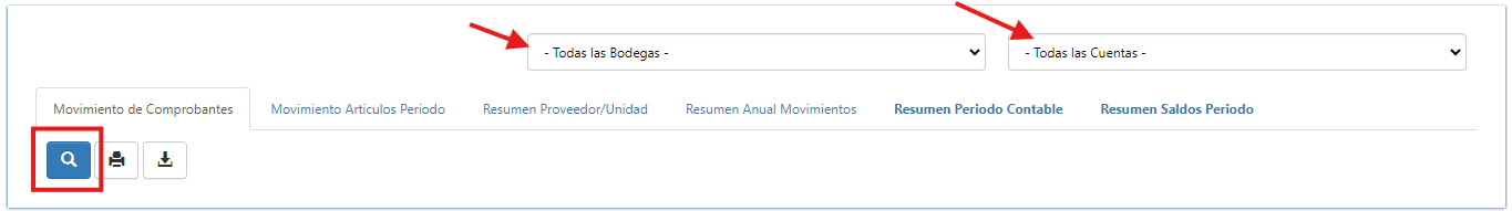 2.- Colocamos a que bodega y cuenta corresponde, damos click en el boton azul de buscar y nos reflejara los reportes