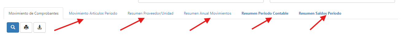 3.- En cada pestaña nos da las opciones de resportes de MOVIMIENTO DE ARTICULOS, RESUMEN PROVEEDOR, RESUMEN ANUAL MOVIMIENTOS, RESUMEN PERIODO CONTABLE, RESUMEN SALDOS PERIODO, damos click a cada uno y ya nos genera el reporte.